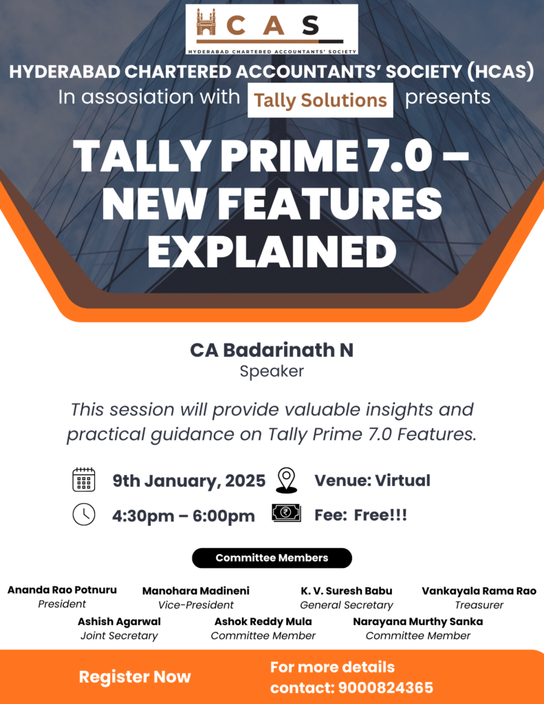 Events Unlocking Tally Prime 7.0: New Features & Practical Insights 📢 HCAS – Webinar Alert 📢 Hyderabad Chartered Accountants’ Society (HCAS) in association with Tally…adminJanuary 5, 2026