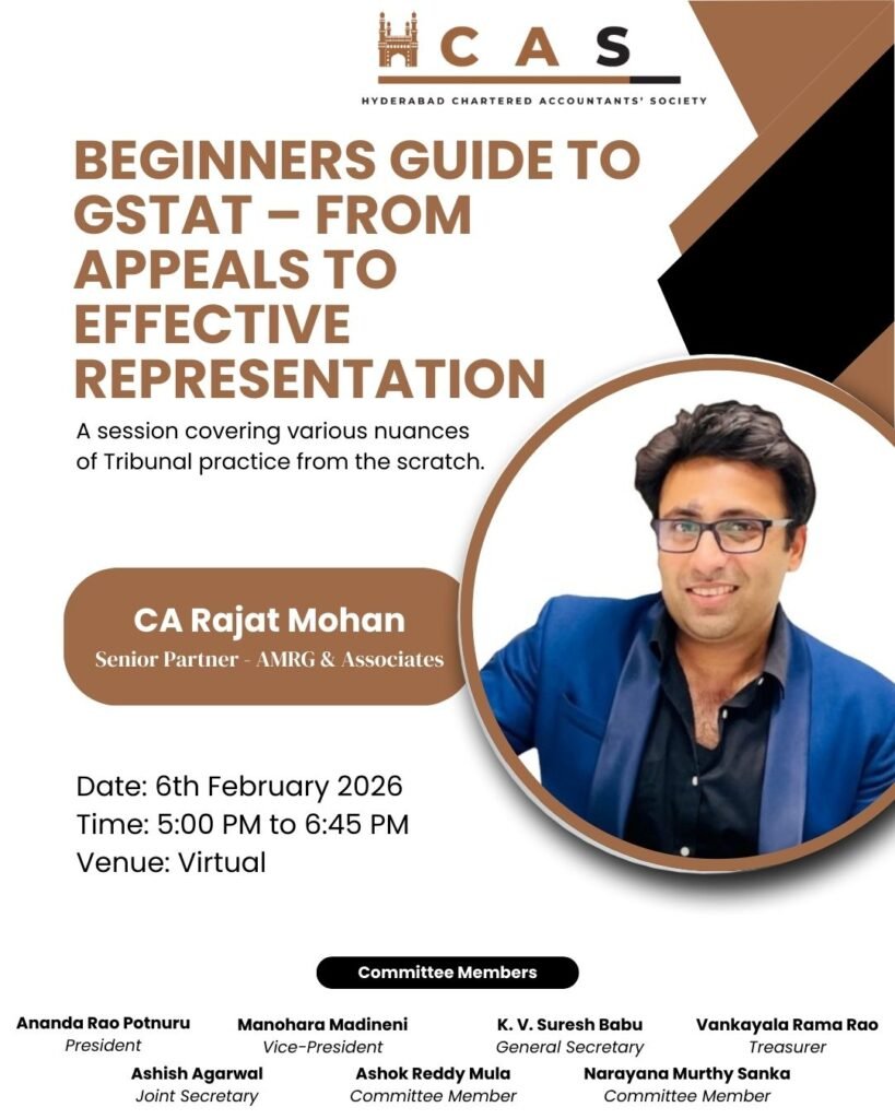 Events HCAS Virtual Session | GSTAT – Beginners Guide HCAS Virtual Session | GSTAT – Beginners Guide Hyderabad Chartered Accountants’ Society (HCAS) is pleased…adminFebruary 4, 2026
